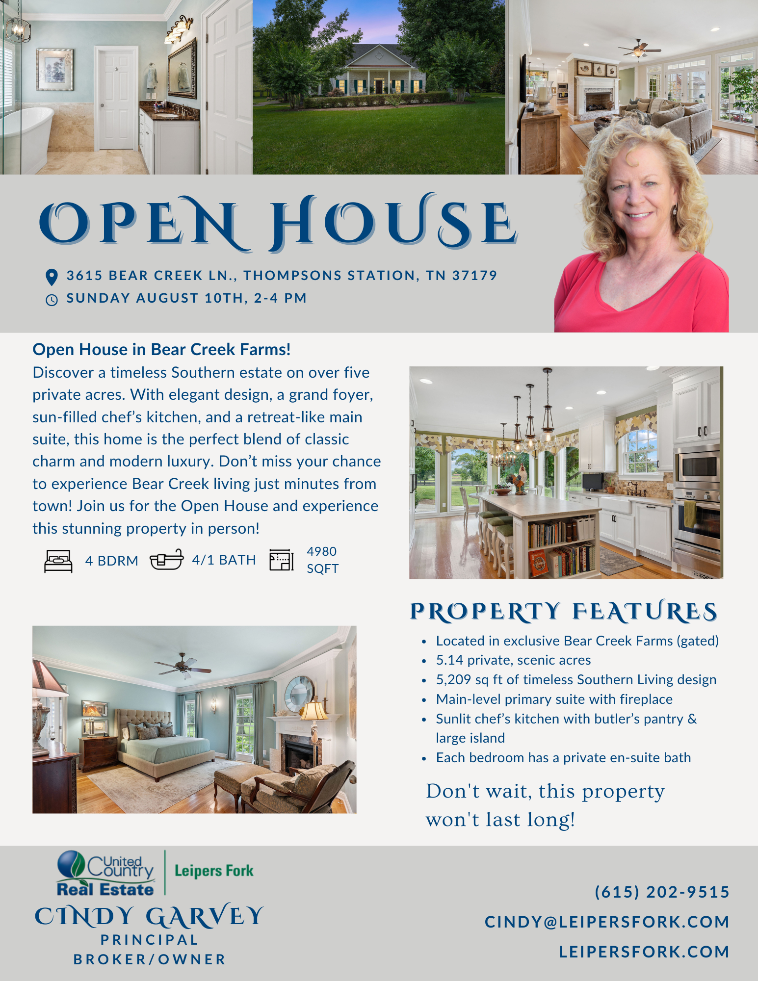 The open house at 3615 Bear Creek Lane is scheduled for August 10th from 2 – 4 PM. This is your chance to experience the luxury and charm of this Thompsons Station home firsthand.