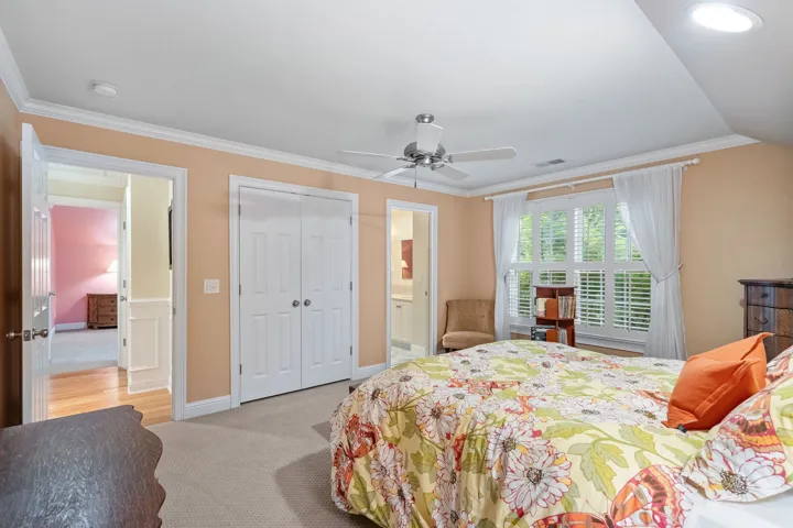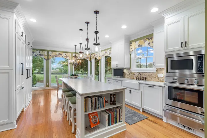 The sun-filled kitchen is a showpiece in every sense, with floor-to-ceiling windows and professional-grade appliances, including a Thermador refrigerator, 36” gas range, 30” electric wall oven, convection microwave, warming drawer, and a full-sized wine refrigerator. A large central island, butler’s pantry, and oversized hidden walk-in pantry provide both functionality and exceptional storage. Upstairs, three additional bedrooms with two baths offer comfort and privacy for family and guests alike.